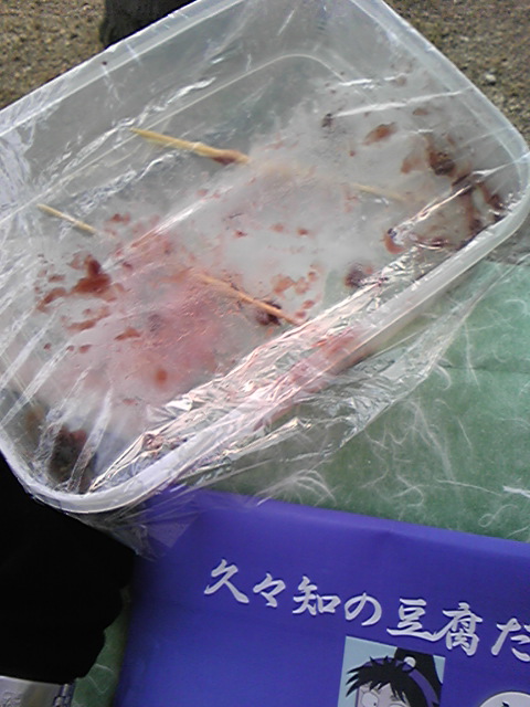 公園にてお団子を頂きまして、総勢9名、「わー!ちゃんと豆腐だー!」とはしゃぎまくり、地元のおじいさまに笑顔を向けられる。豆腐団子、私の舌には絶品でしたよ!他の皆様も絶賛してました!二串食べた方もいたりしたので、皆美味しく頂けた事かと…!